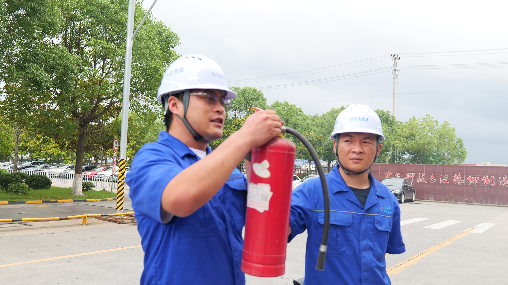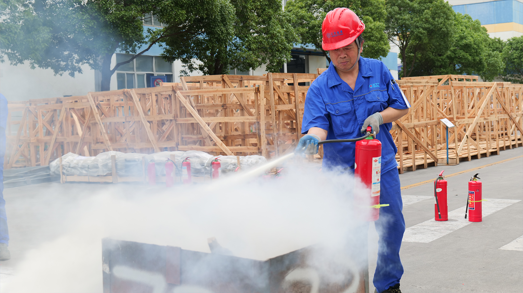 江东金具安环部副经理蒲贵东组织消防器材的灭火演练,对本公司消防器材和设备的功能用途讲解。